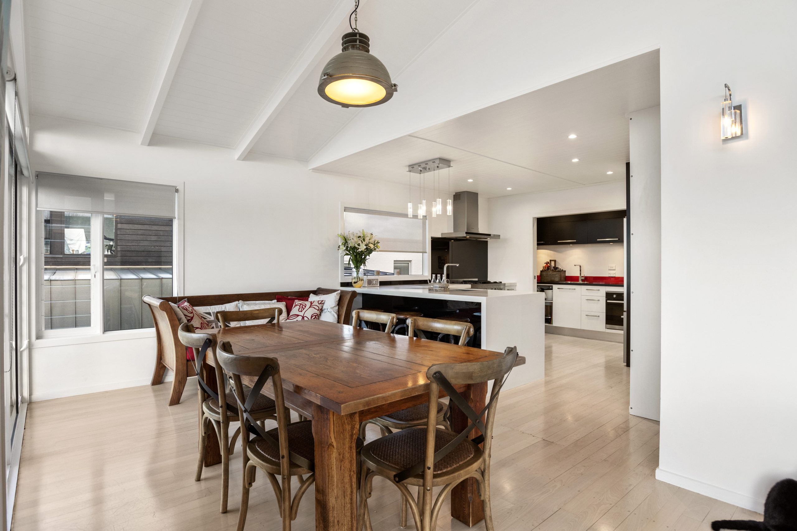 The house is set over two levels with the main living areas upstairs. There is a large, open plan kitchen which opens up to the dining and living areas. From here you can access the deck at the front of the property.